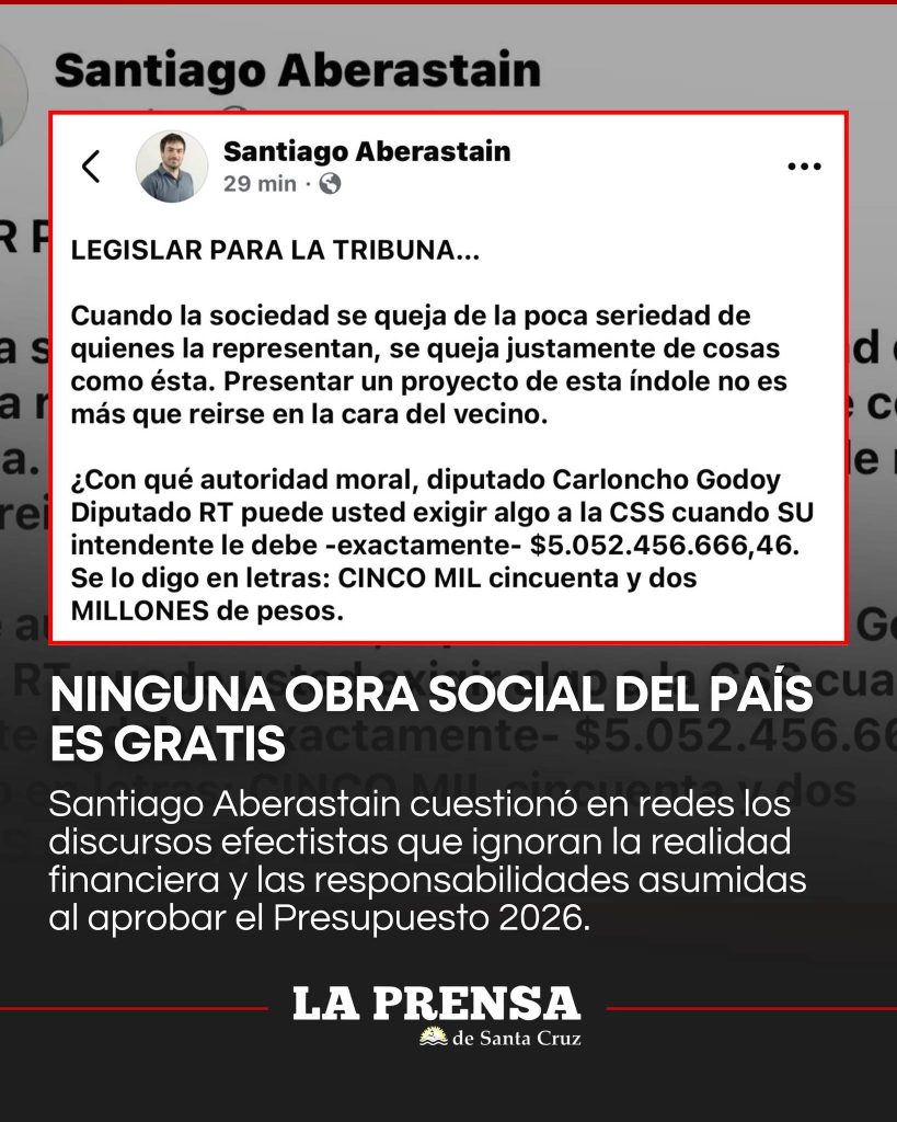 El diputado provincial Santiago Aberastain cuestionó con dureza los discursos y proyectos que, según señaló, buscan impacto político inmediato pero desconocen la realidad financiera del sistema de salud. En ese marco, advirtió que no existe ninguna obra social gratuita y que plantear lo contrario implica una falta de seriedad y de respeto hacia los vecinos que cumplen mensualmente con sus obligaciones.