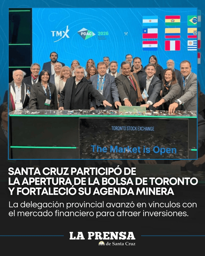 En el marco de la PDAC 2026, autoridades del Gobierno de Santa Cruz participaron de una intensa agenda institucional en la Bolsa de Toronto (TSX), uno de los principales centros financieros vinculados a la industria minera a nivel mundial.