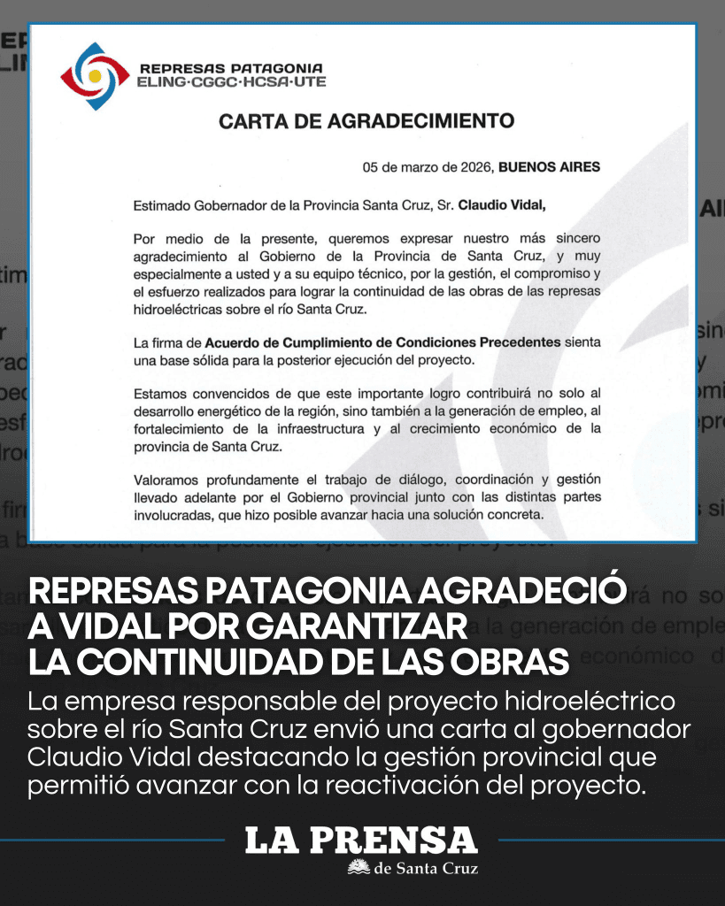 La empresa Represas Patagonia, encargada de la construcción de las centrales hidroeléctricas sobre el río Santa Cruz, envió una carta formal al gobernador Claudio Vidal para expresar su agradecimiento por las gestiones realizadas por el Gobierno provincial que permitieron garantizar la continuidad del proyecto.
