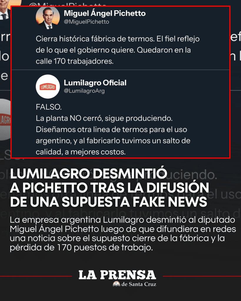 La empresa argentina Lumilagro salió a responder públicamente al diputado nacional Miguel Ángel Pichetto luego de que el dirigente difundiera en redes sociales una noticia que aseguraba el cierre de la histórica fábrica de termos y la pérdida de 170 puestos de trabajo.