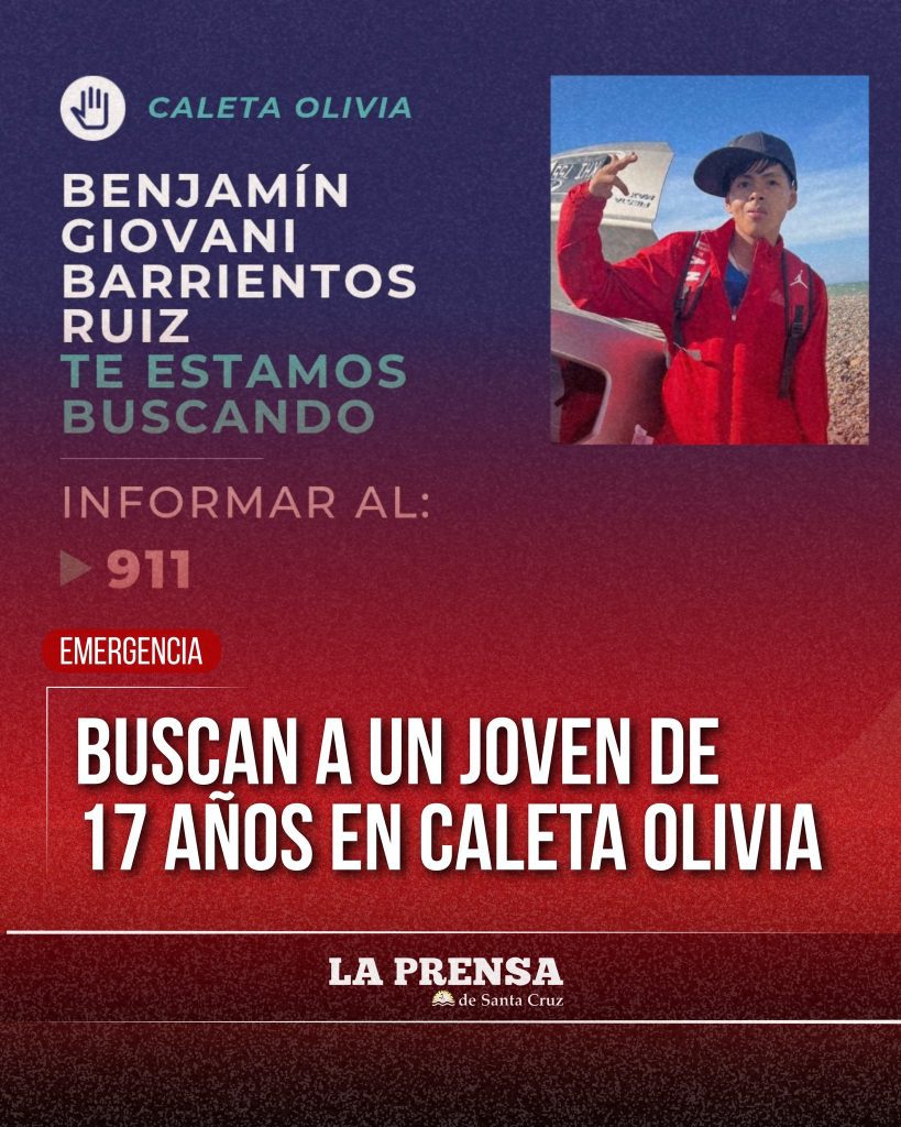 La Policía de Santa Cruz solicita la colaboración de la comunidad para ubicar a Benjamín Giovani Barrientos Ruiz, de 17 años, quien fue visto por última vez en Caleta Olivia.